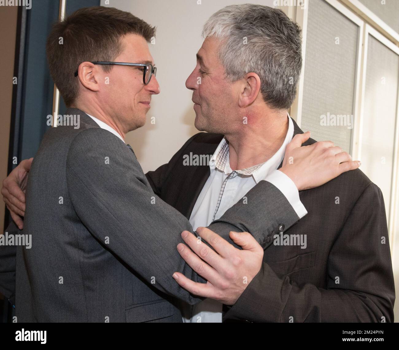 Der Neue Minister Pierre Yves Dermagne Und Der Ehemalige Minister Paul Furlan Bildeten Das Bild Bei Der Ubergabe Der Schlussel Des Kabinetts Des Wallonischen Ministers Fur Kommunen Stadte Wohnungsbau Und Energie In Beez